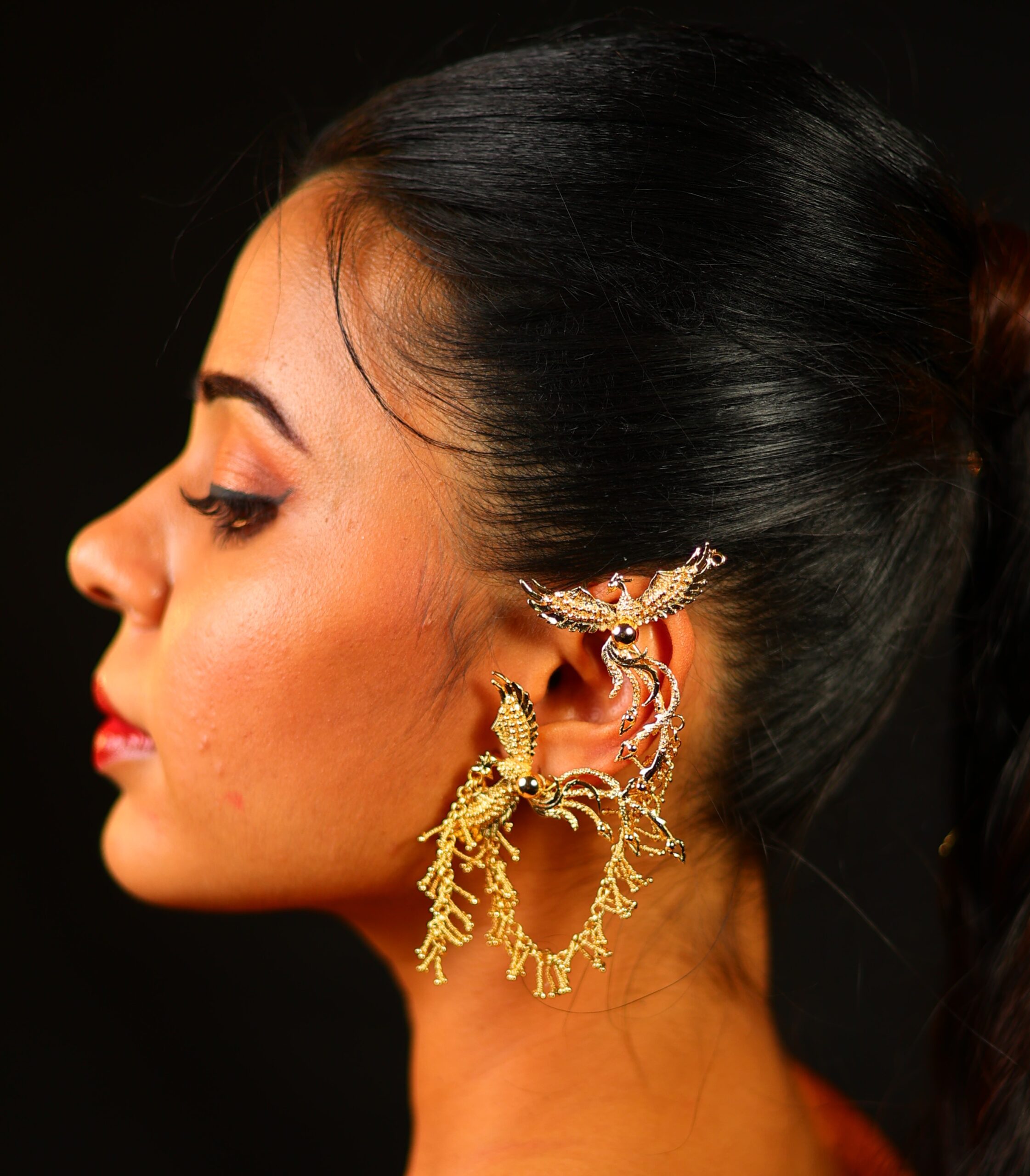 ₹22500Rising Phoenix Earcuffs – Inspired by the mythic phoenix, these earcuffs rise in sculptural grace—bold, transformative, and unapologetically powerful. Designed as wearable art, they trace the ear with fluid movement and couture drama, symbolizing strength, rebirth, and fearless self-expression.