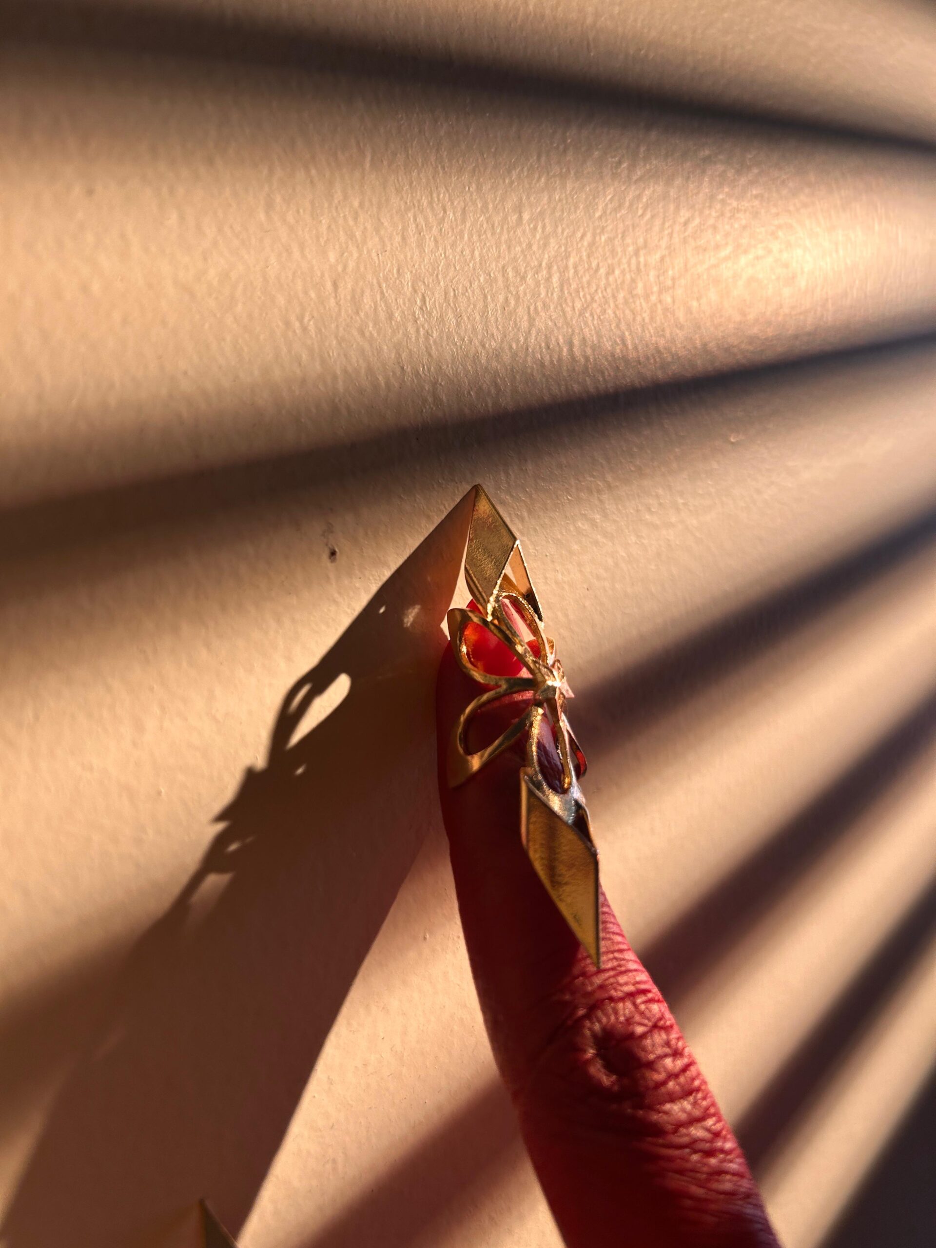 A sculptural statement inspired by a blooming aurelia flower, this nail ring wraps the fingertip in fluid gold-toned forms with a striking crimson accent. Handcrafted to balance strength and elegance, it’s designed for those who embrace bold artistry and contemporary luxury. Perfect worn solo or layered for a dramatic finish.