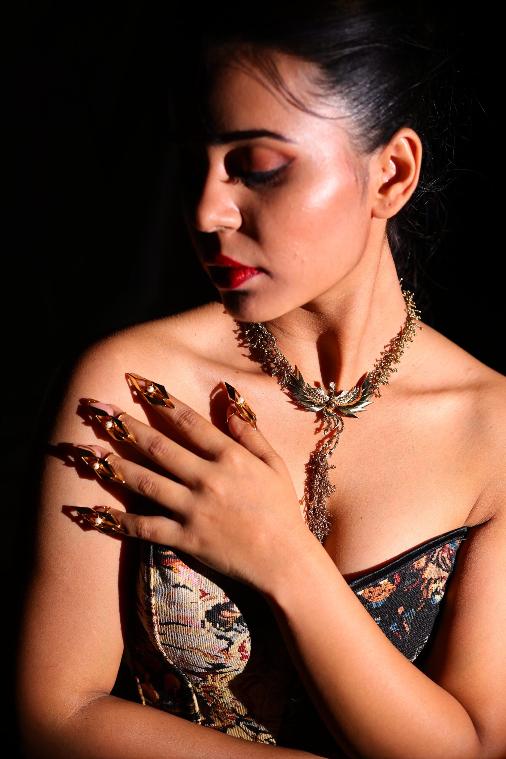 A sculptural statement necklace crafted with intricate detailing and an organic silhouette. Designed to move beautifully with the wearer, it brings depth, drama, and timeless elegance to bridal and elevated occasion ensembles.