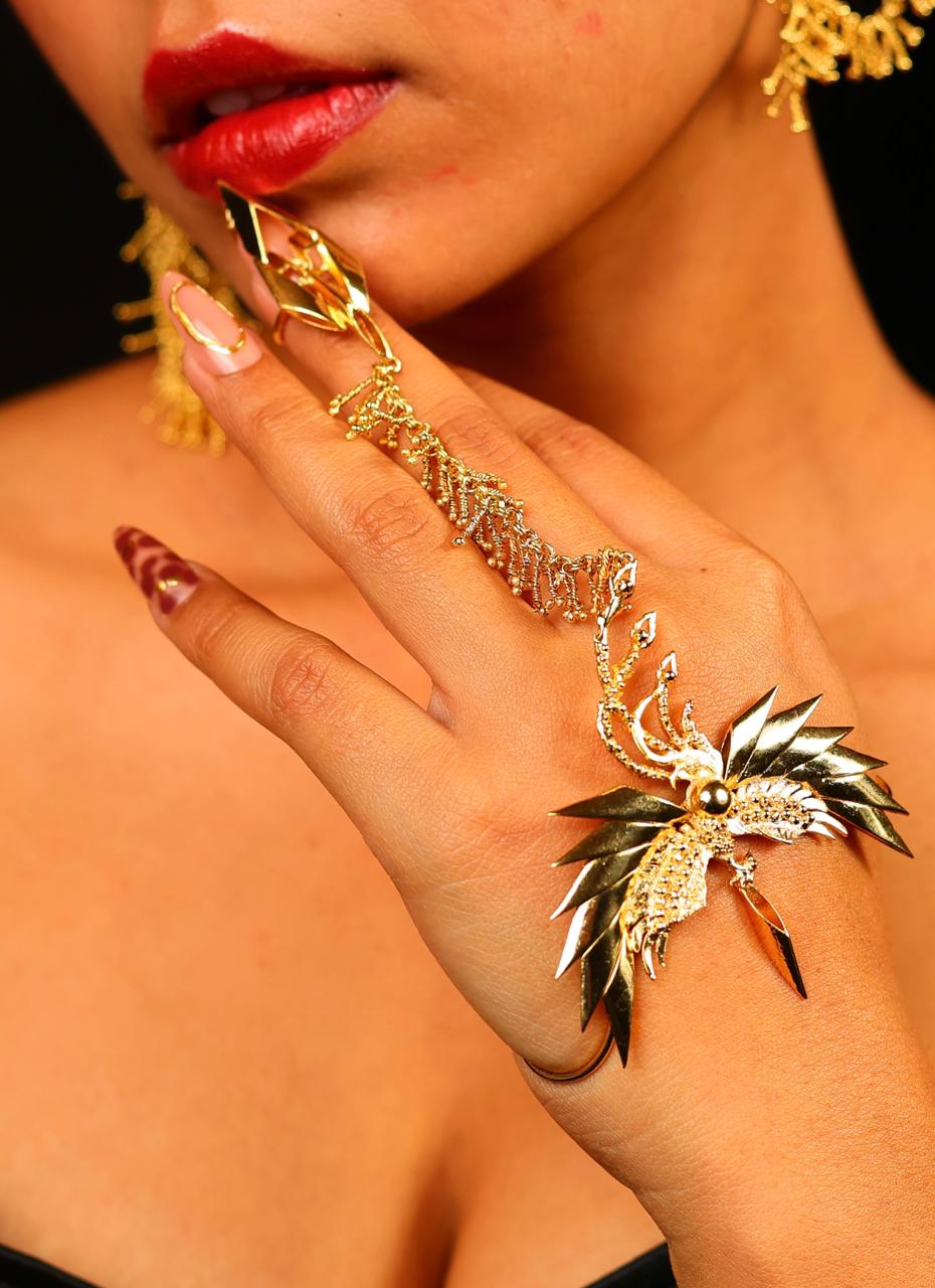 Embodying the spirit of transformation, this palm cuff captures the elegance of a phoenix mid-flight. Its sculptural wings curve around the hand in a golden embrace, symbolizing strength, beauty, and rebirth. A symbolic jewel for souls who continually rise, reborn in their own brilliance.