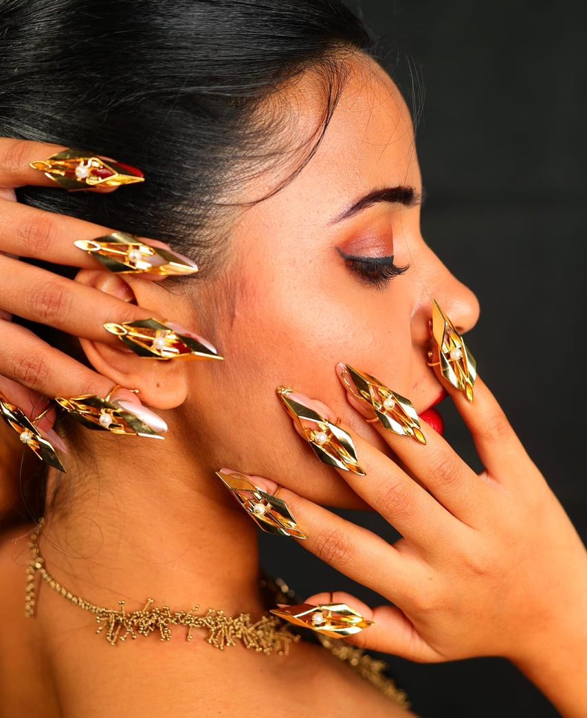 ₹2800Path of Valor Nail Ring A bold fusion of artistry and strength, the Path of Valor Nail Ring features sculpted metallic forms accented with delicate pearls. Designed to command attention, it embodies confidence, luxury, and modern elegance—perfect for those who wear their power with style.
